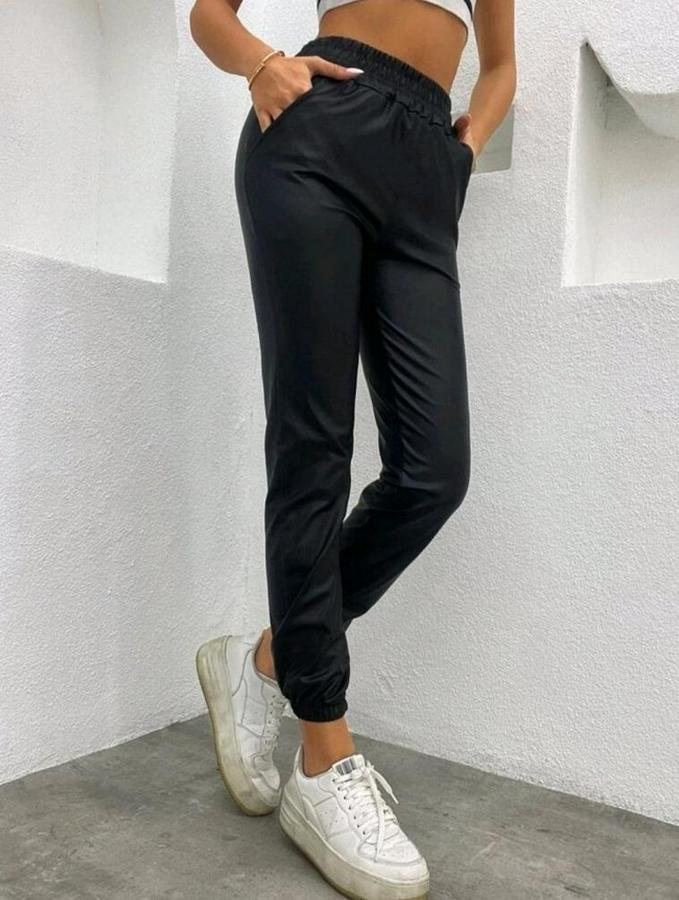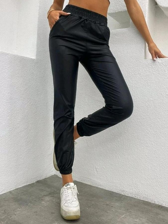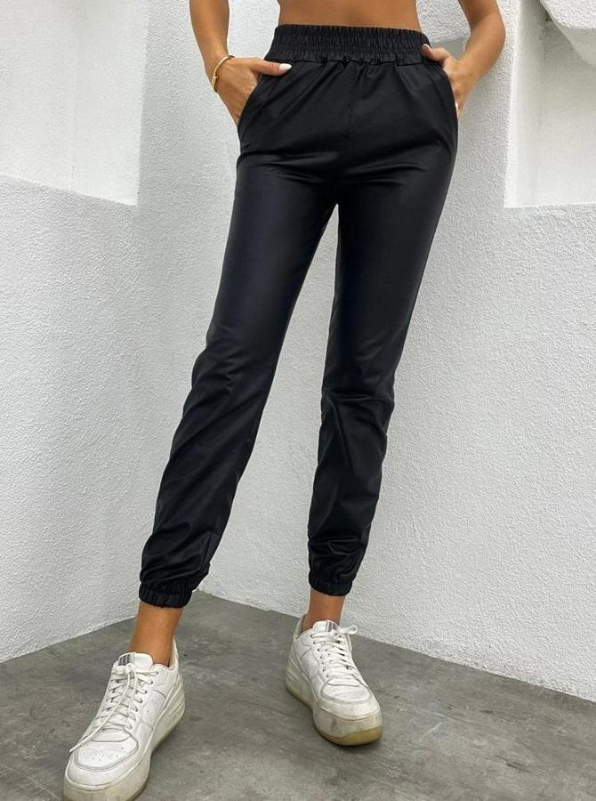 Paçası Lastikli Cep Detaylı Deri Tayt Pantolon