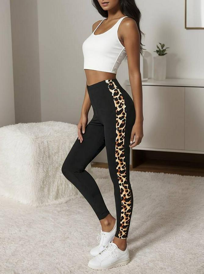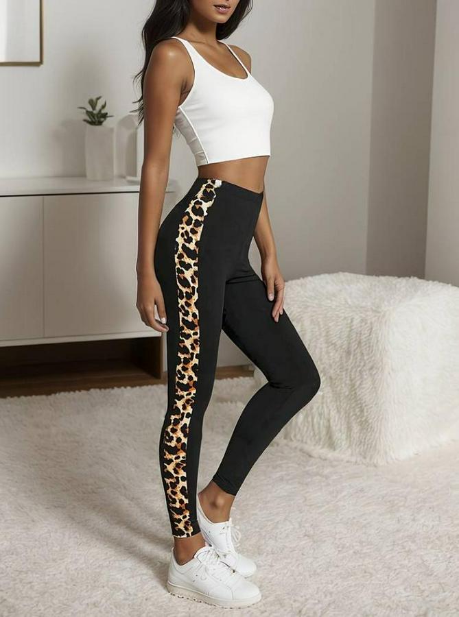 AnasayfaTüm ÜrünlerAlt GiyimTaytYüksek Bel Yanları Leopar Şerit Detay Dalgıç Tayt