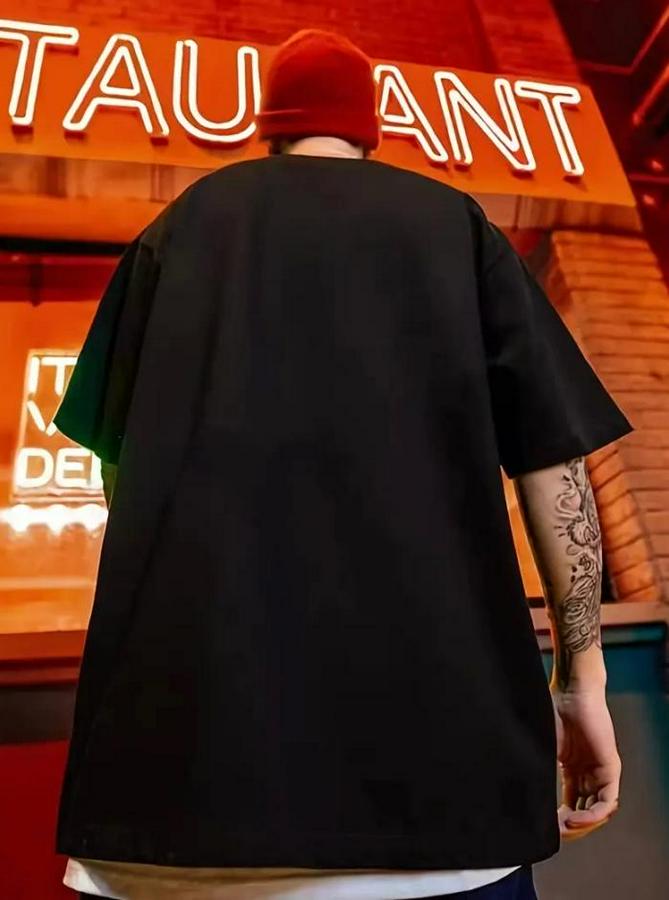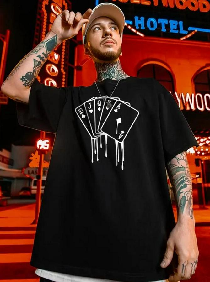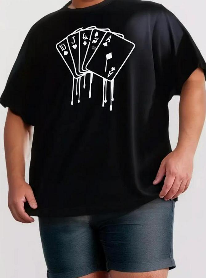 Erkek Büyük Beden Kart Baskılı Düz Renk Kısa Kollu Bisiklet Yaka Tişört Gündelik Giyim - Siyah