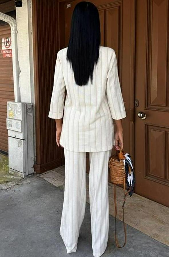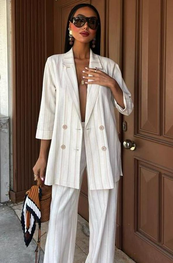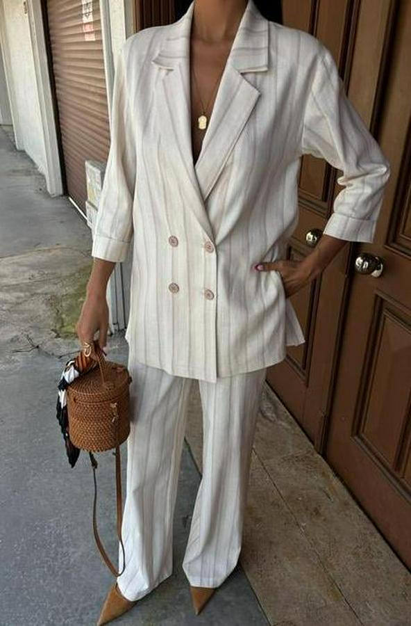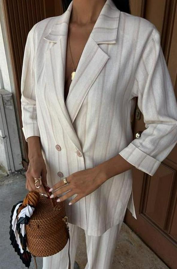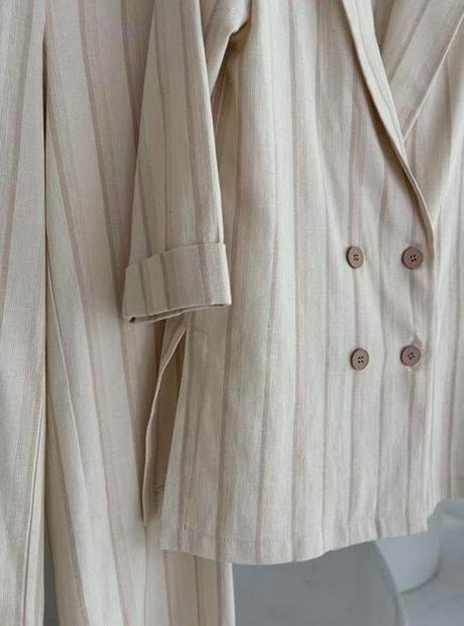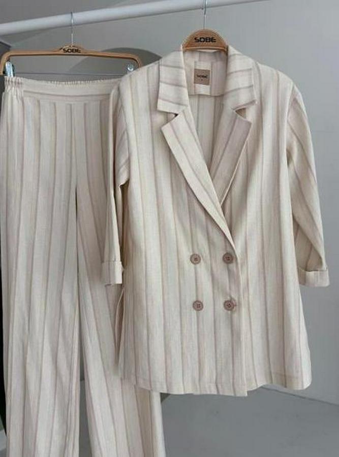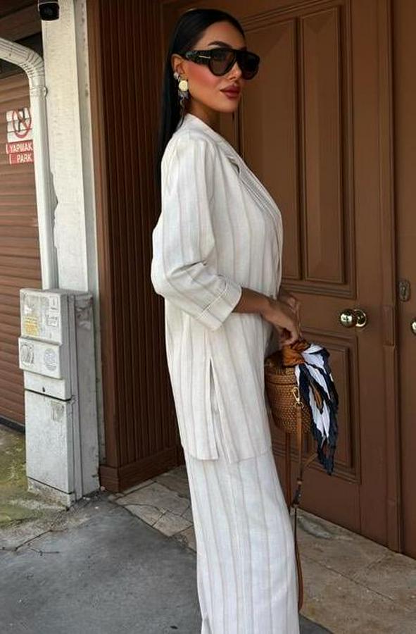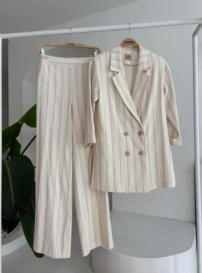 AnasayfaTüm ÜrünlerDış GiyimCeket & YelekCeketBlazer Ceketli Çizgili Keten Takım 10186