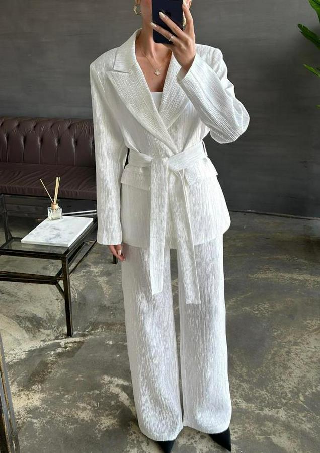 AnasayfaTüm ÜrünlerDış GiyimCeket & YelekCeketEkru Beli Kuşaklı Ceket Ve Pantolon Parlak Takım