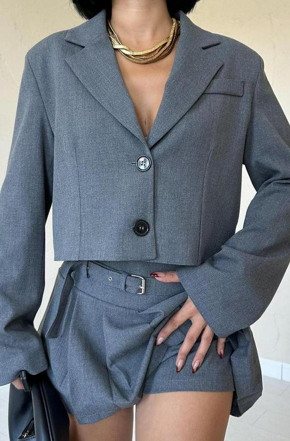 AnasayfaTüm ÜrünlerDış GiyimCeket & YelekCeketGri Bomber Ceket Ve Pileli Etek Takım