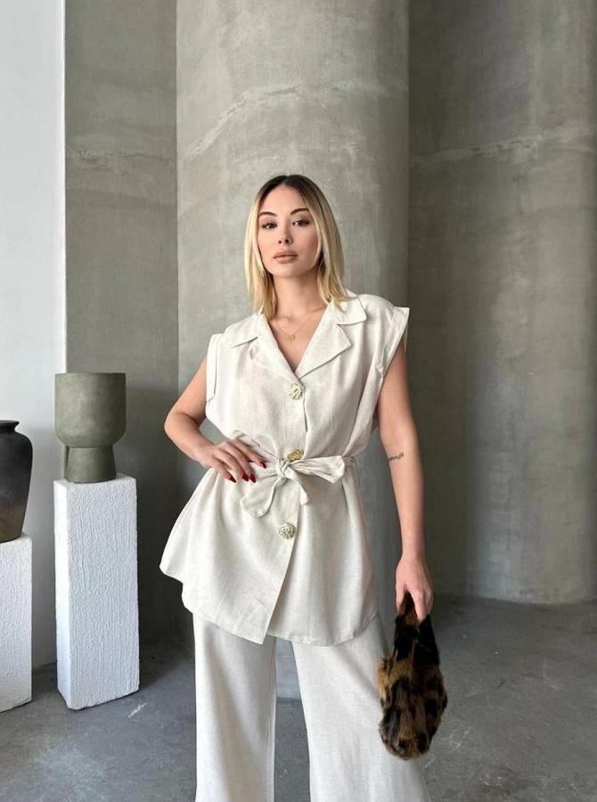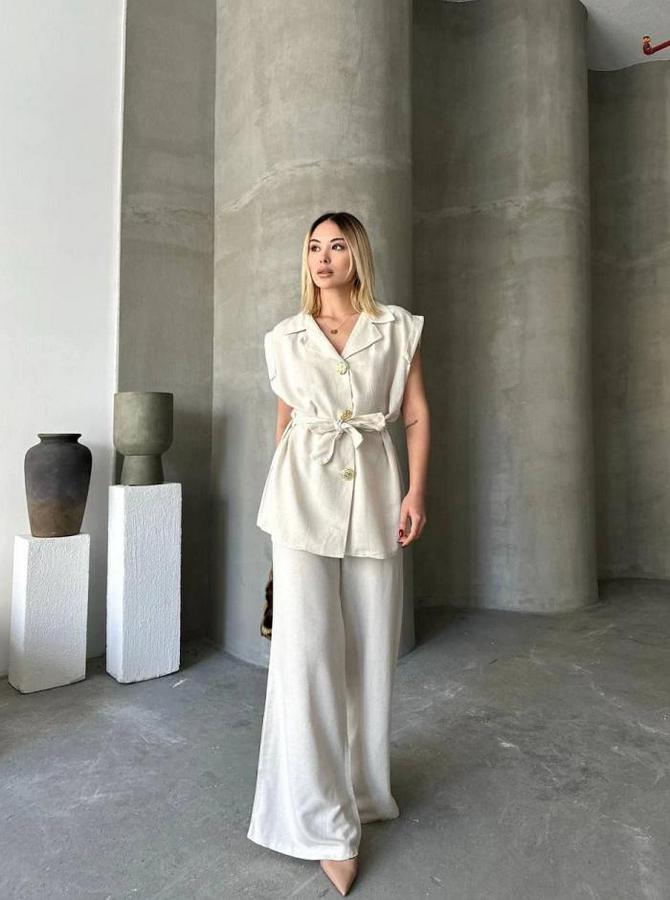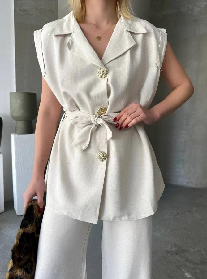 Keten Sıfır Kol Kuşaklı Ceket Pantolon Ikili Takım