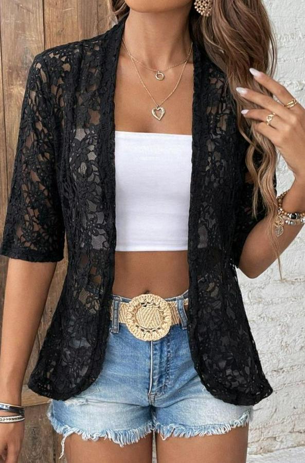 AnasayfaTüm ÜrünlerDış GiyimCeket & YelekCeketKısa Kollu Önü Açık Dantelli Ceket