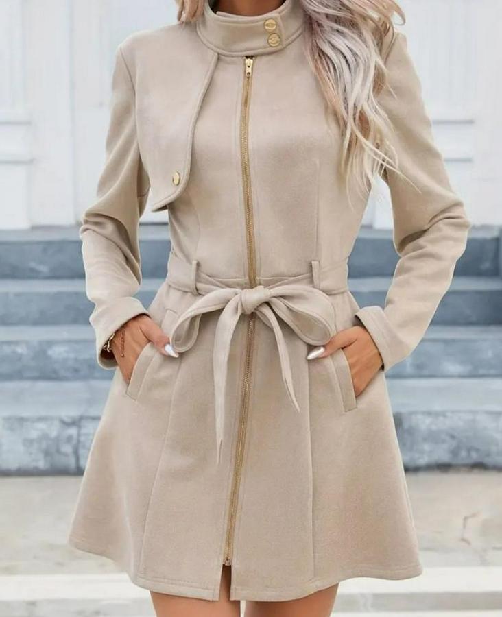 Uzun Kollu Boyundan Düğmeli Fermuarlı Beli Kuşaklı Süet Ceket