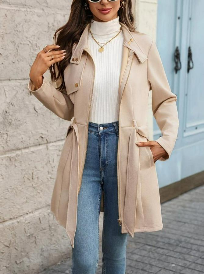Kadın Uzun Kollu Boyundan Düğmeli Fermuarlı Beli Kuşaklı Süet Ceket