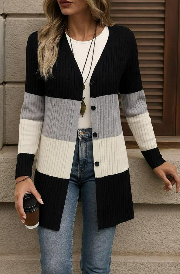 Uzun Kollu Çok Renkli Önden Düğmeli Uzun Ceket