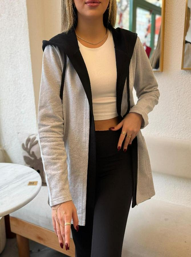 Uzun Kollu Kapşonlu Çift Renkli Şardonlu Iki Iplik Ceket