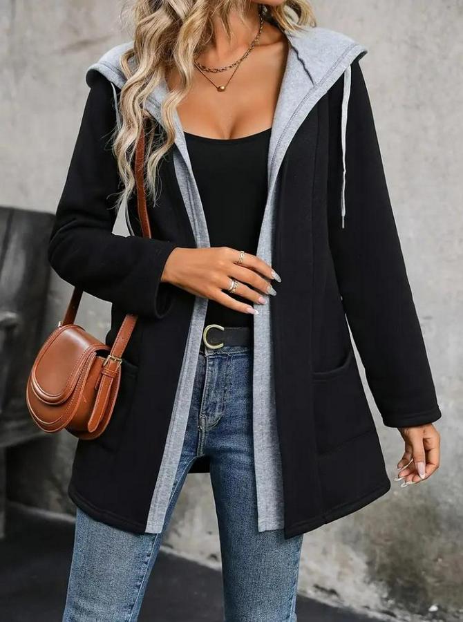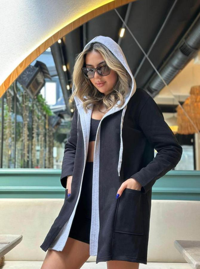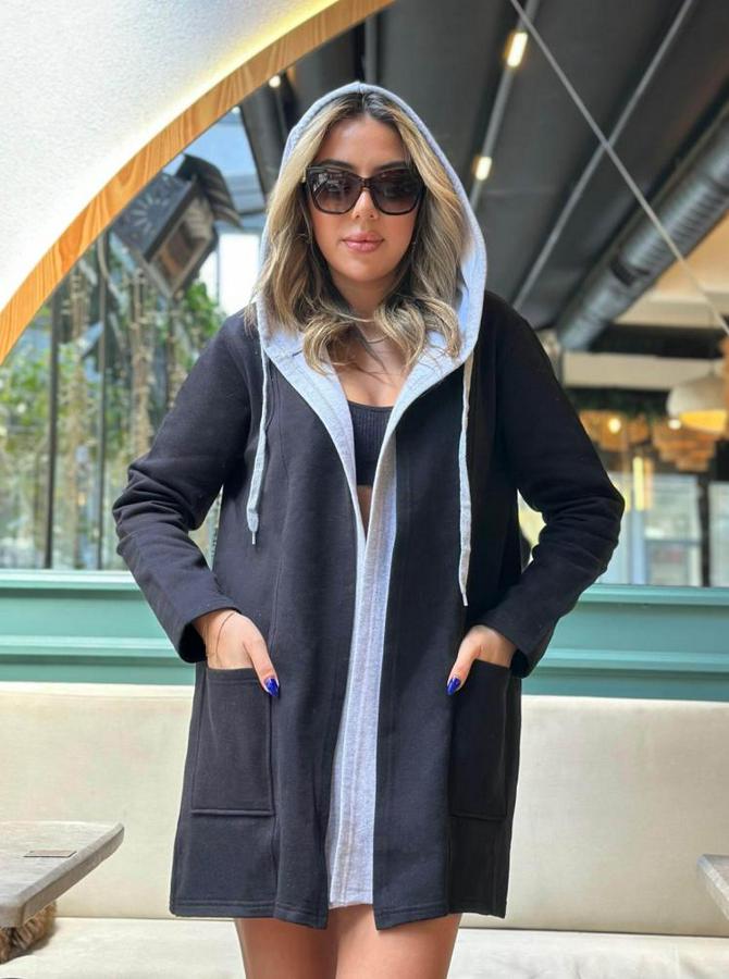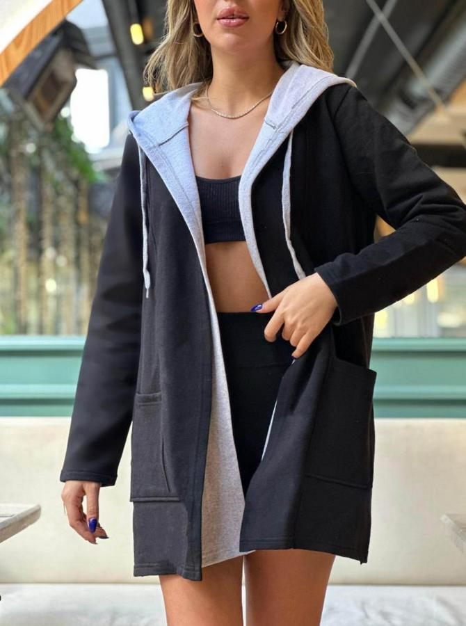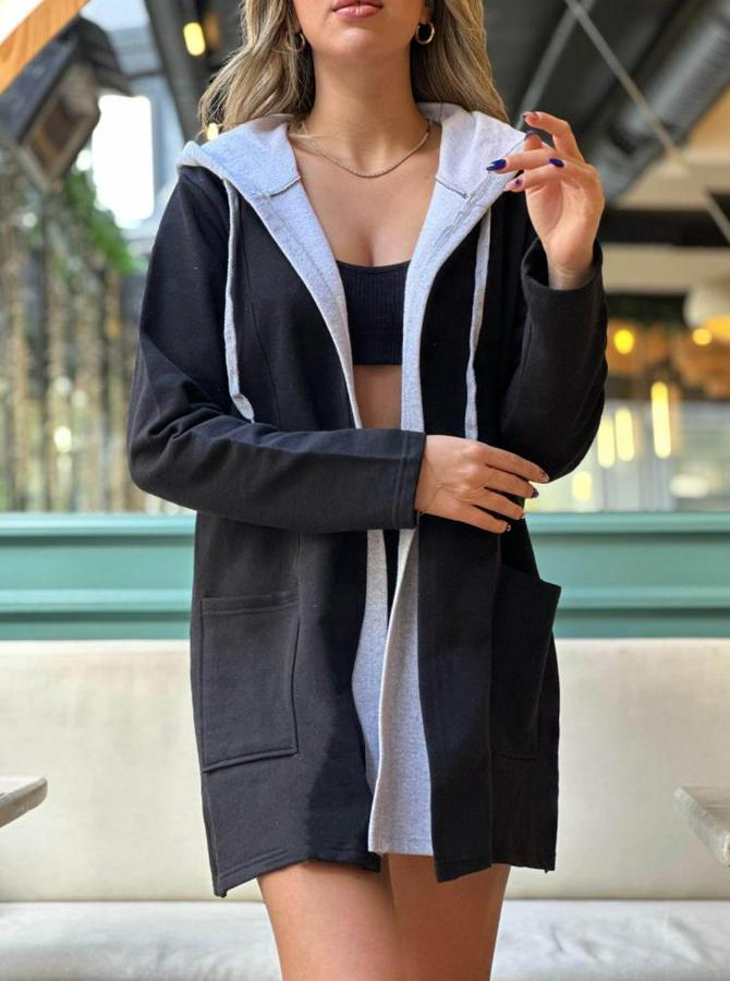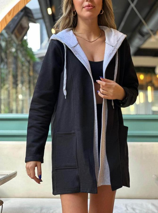 Uzun Kollu Kapşonlu Çift Renkli Şardonlu Iki Iplik Ceket