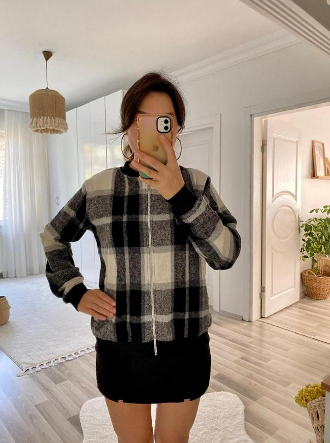 Uzun Kollu Önden Fermuarlı Ekose Desenli Ceket