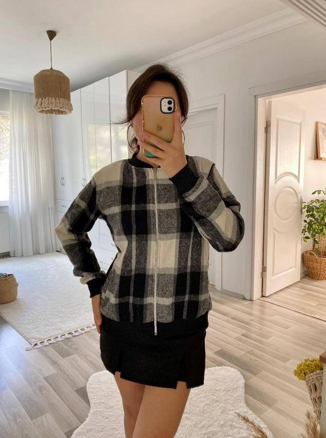 Kadın Uzun Kollu önden Fermuarlı Ekose Desenli Ceket