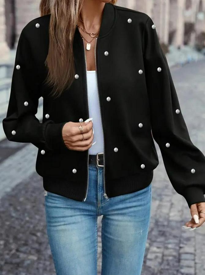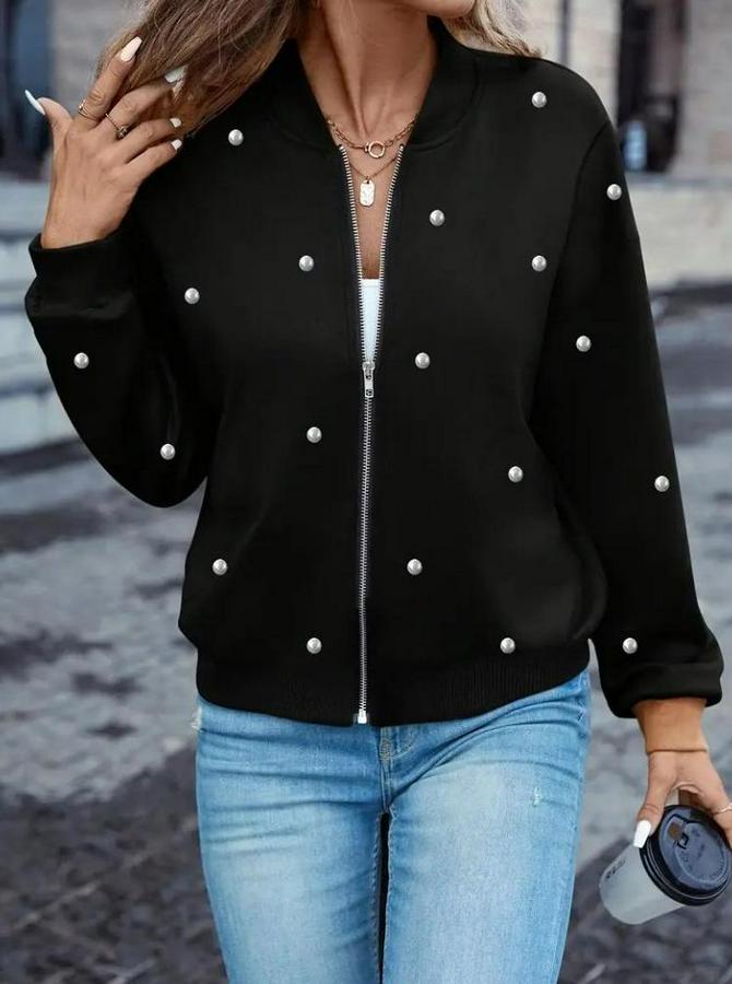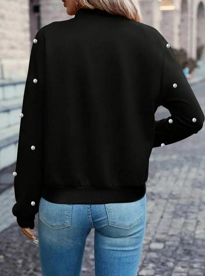 Uzun Kollu Önden Fermuarlı Incili Kısa Modal Ceket