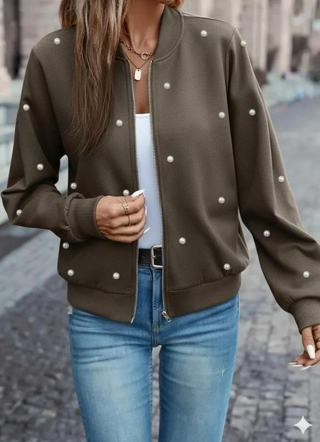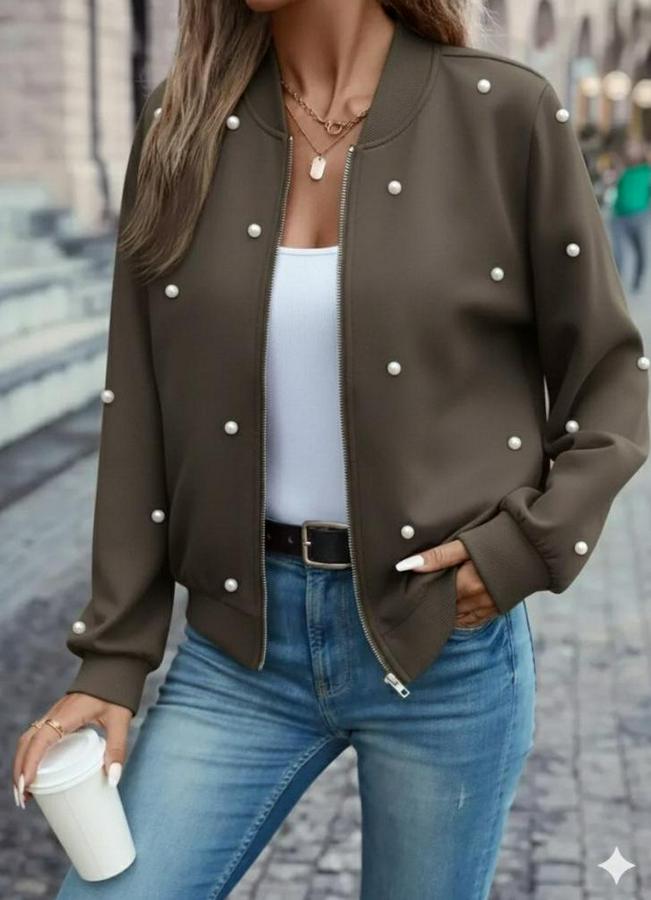 AnasayfaTüm ÜrünlerDış GiyimCeket & YelekCeketUzun Kollu Önden Fermuarlı Incili Kısa Modal Ceket