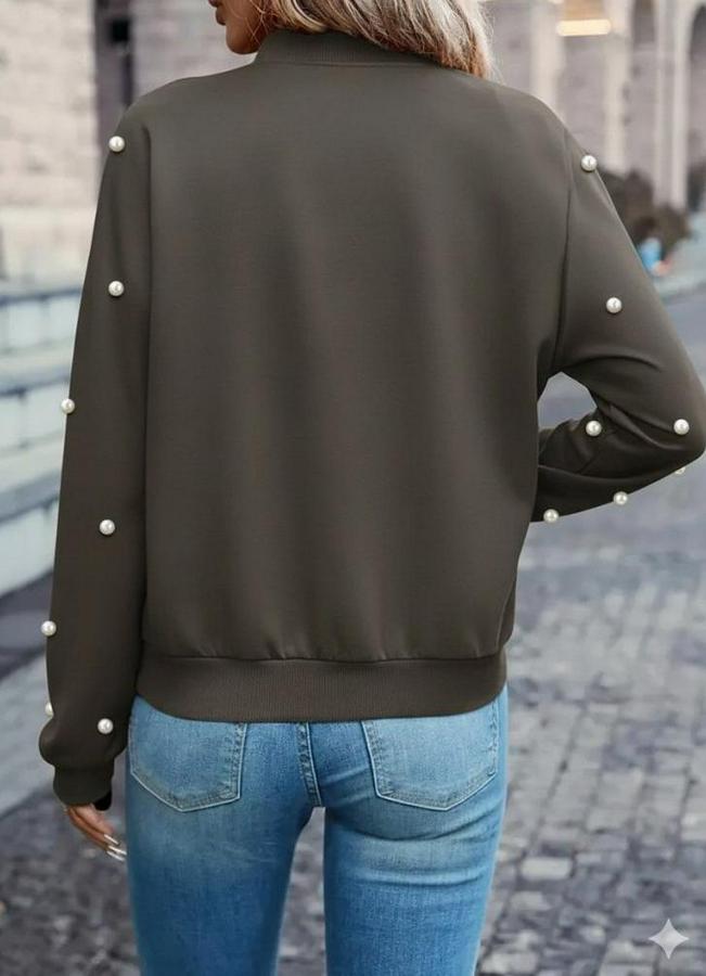 Uzun Kollu Önden Fermuarlı Incili Kısa Modal Ceket