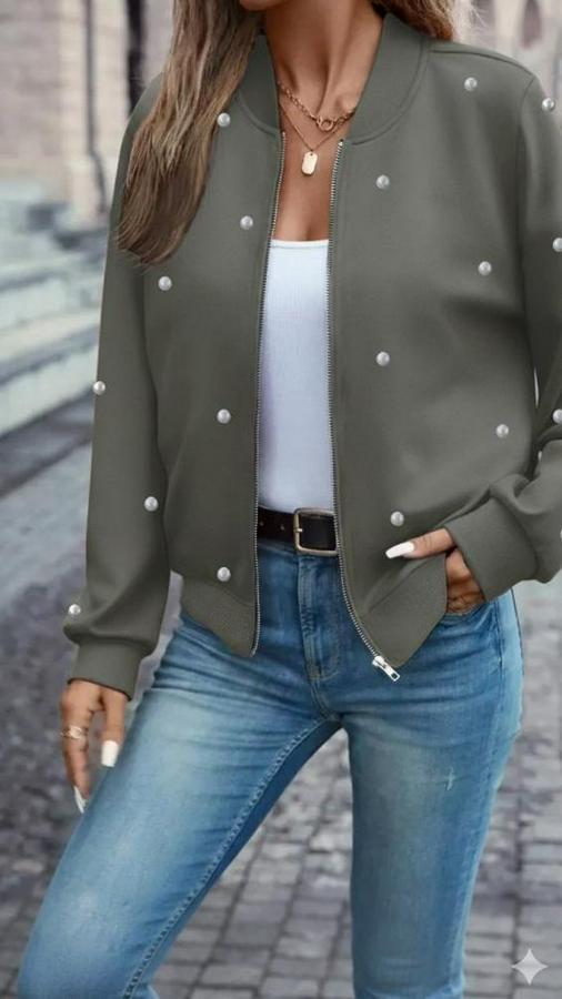 Kadın Uzun Kollu önden Fermuarlı Incili Kısa Modal Ceket