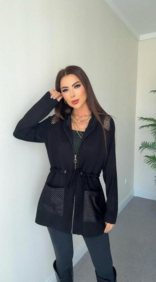 Uzun Kollu Önü Fermuarlı File Detaylı Belden Bağcıklı Kısa Modal Ceket