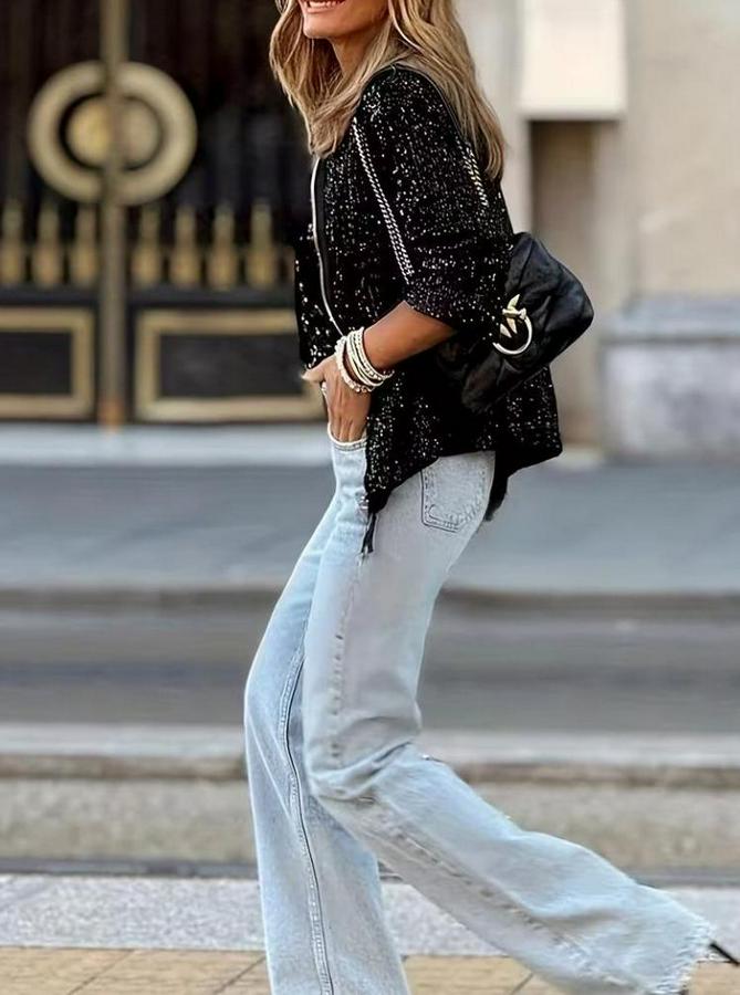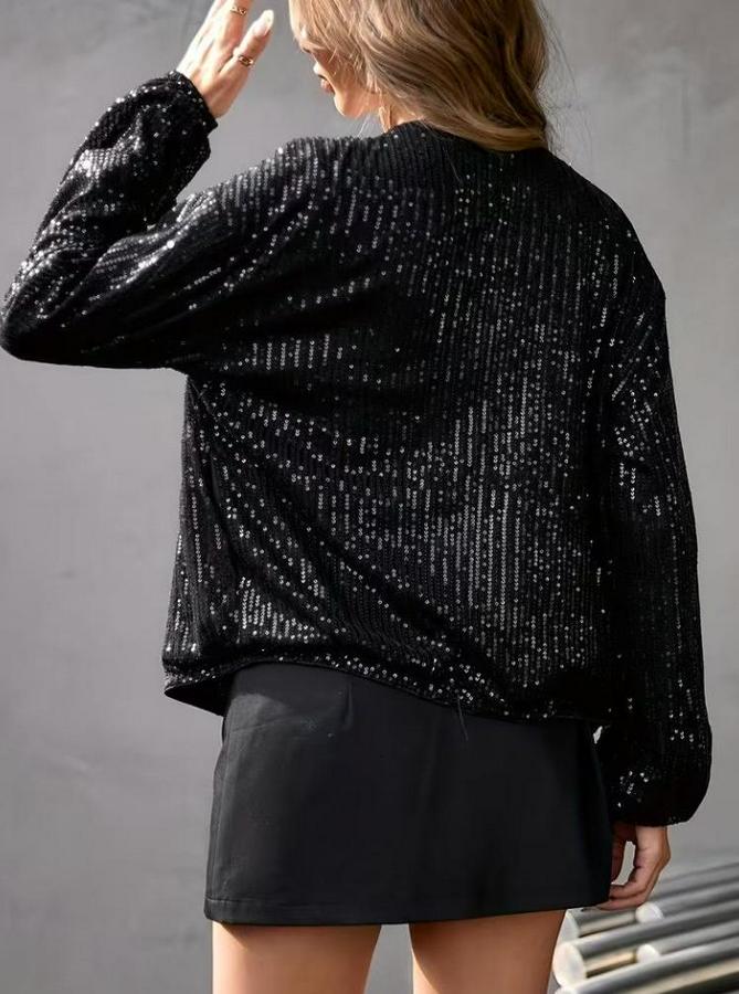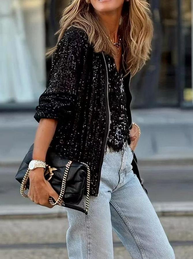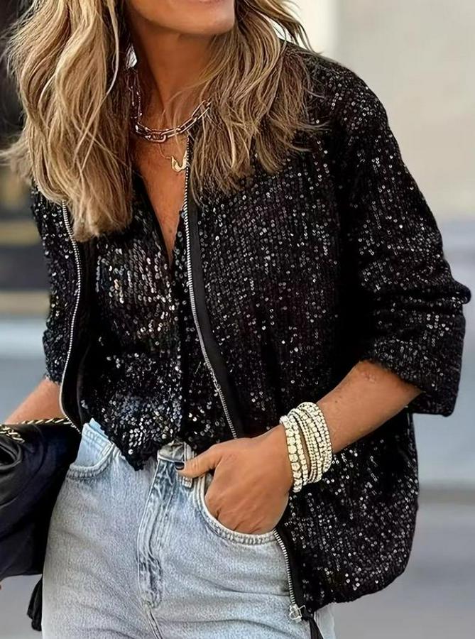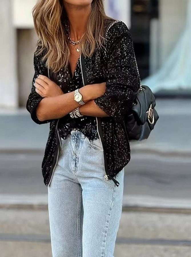 AnasayfaTüm ÜrünlerDış GiyimCeket & YelekCeketUzun Kollu Önü Fermuarlı Kısa Pulpayet Ceket