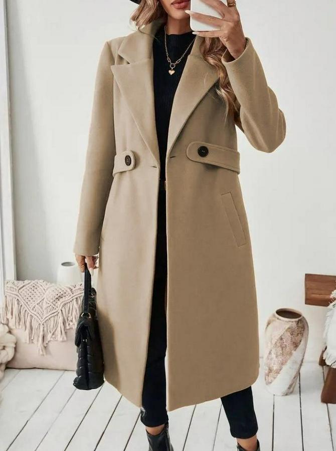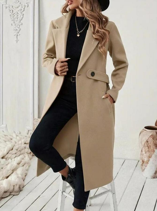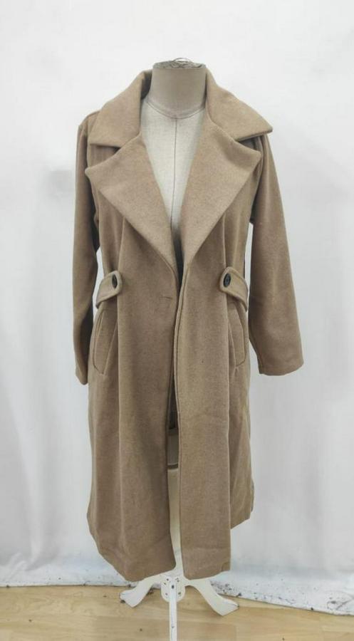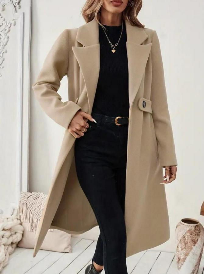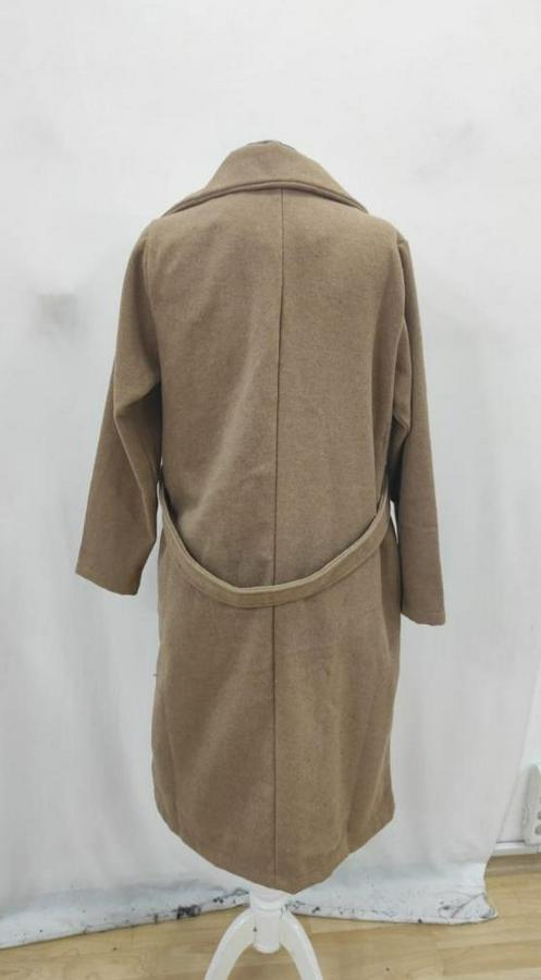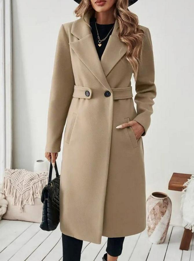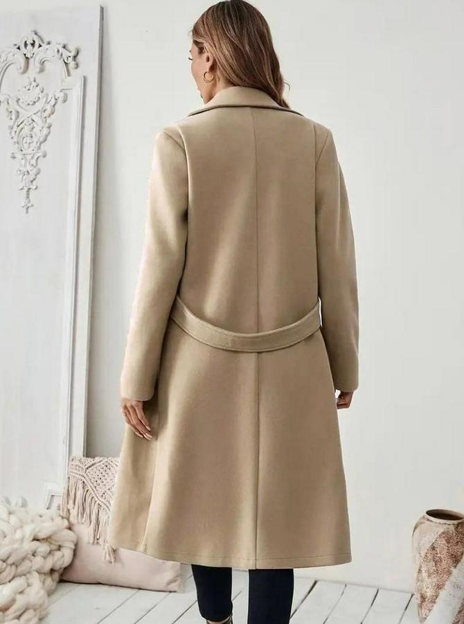 Uzun Kollu Yakalı Belde Şerit Düğme Detaylı Cepli Mini Kaşe Kaban