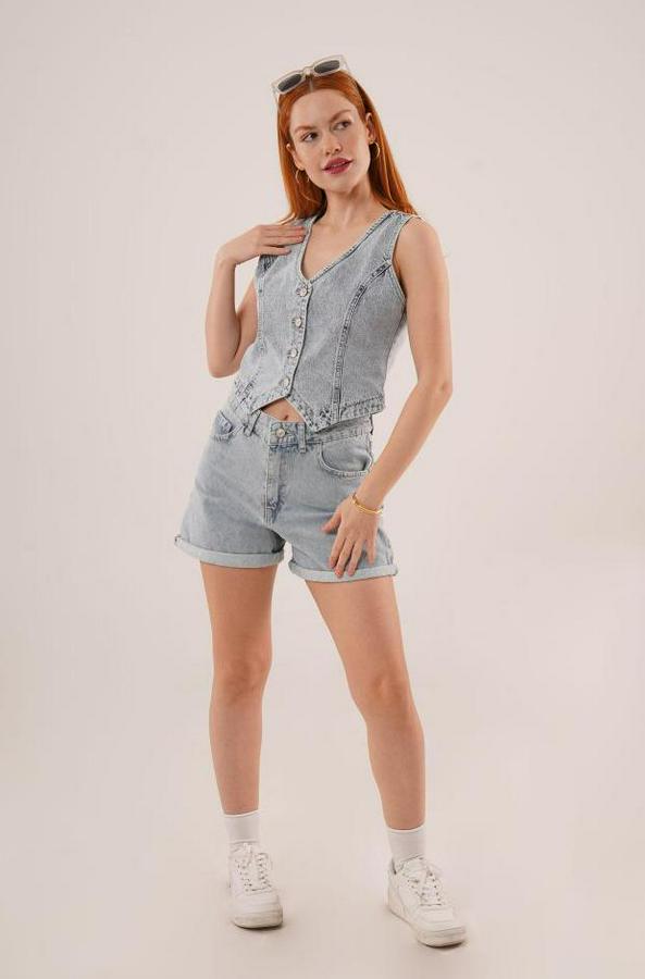 Düğme Ve Ön Dikiş Detaylı Mavi Jean Yelek