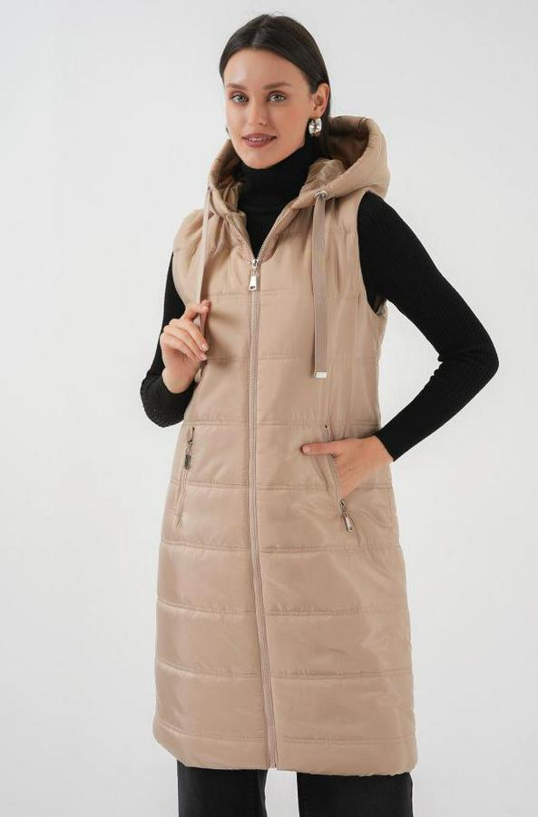 5140 Kapşonlu Uzun Şişme Yelek - Bisküvi