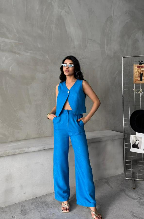 KETEN TEK DÜĞME YELEK-PANTOLON TAKIM - Mavi