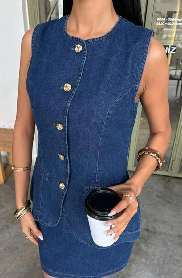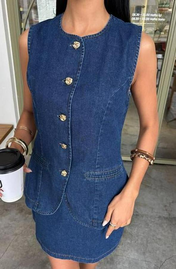 AnasayfaTüm ÜrünlerDış GiyimCeket & YelekYelekKolsuz Yelekli Mini Etekli Denim Takım 10164