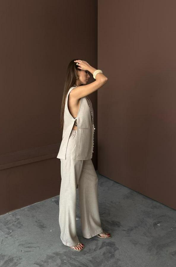 YAKA MİDYE KABUĞU SIRALI YELEK - PANTOLONTAKIM KETEN KUMAŞ - Ham