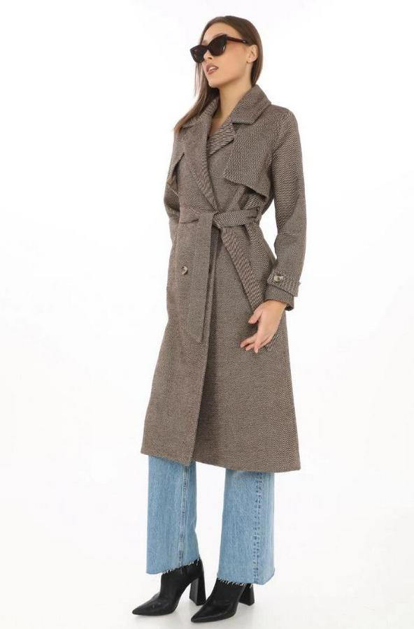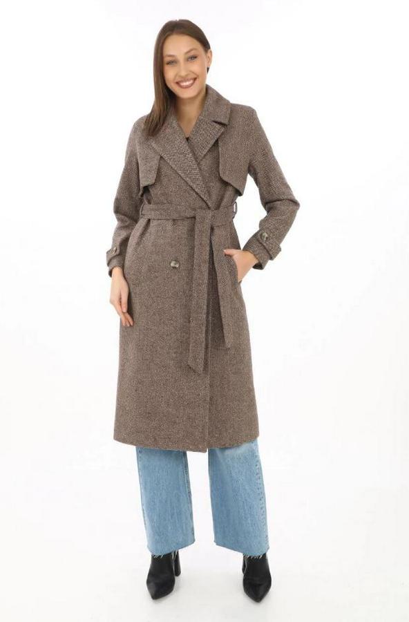 Balık Sırtı Yünlü Dokuma Kaşe Kaban – Kruvaze Yaka, Kuşaklı, Cepli, Astarlı Uzun Boy Tesettür Şık Kışlık Kaşe Kaban Modeli - Vizon