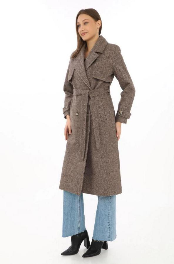 Balık Sırtı Yünlü Dokuma Kaşe Kaban – Kruvaze Yaka, Kuşaklı, Cepli, Astarlı Uzun Boy Tesettür Şık Kışlık Kaşe Kaban Modeli - Vizon