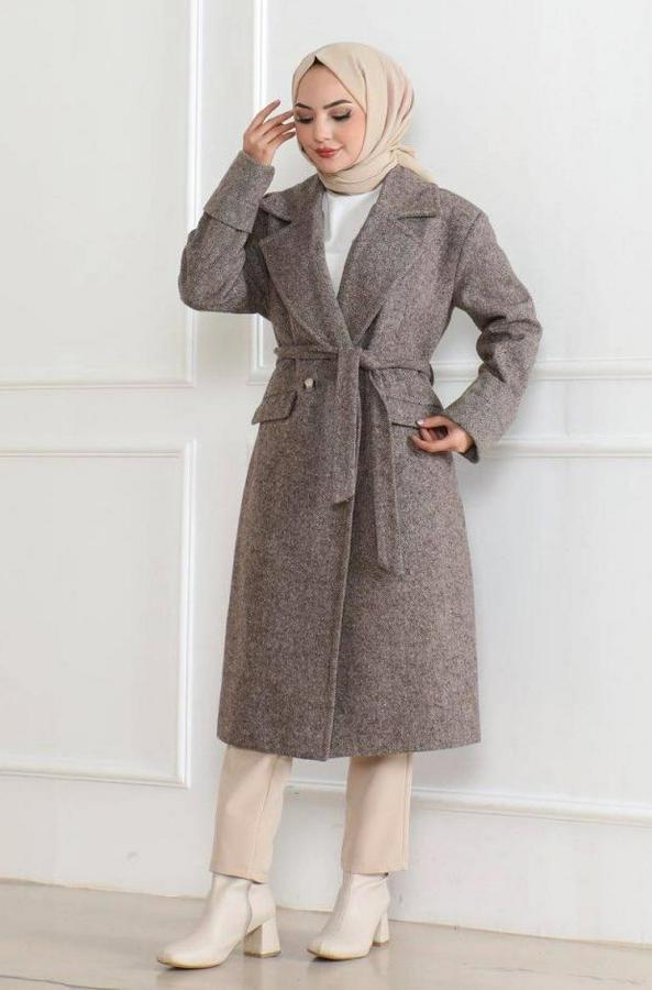 Beli Kuşaklı Yünlü Dokuma Kaşmir Kaban - Vizon