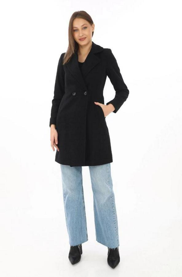 Kaşe Kaban – Siyah Yünlü Dokuma, Kruvaze Yaka, Astarlı, Cepli, Kuşaklı Uzun Boy Tesettür Uyumlu Kışlık Şık Kaban - Siyah