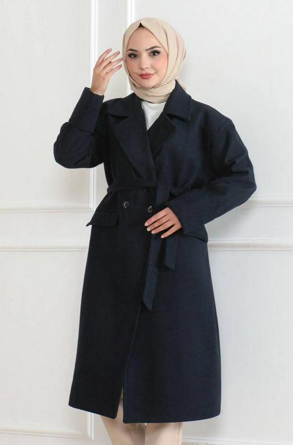 Kaşe Kaban – Uzun Boy Kruvaze Yaka Kuşaklı Tesettür Kaşe Kışlık Kaban, Astarlı Şık Yünlü Dokuma Oversize Rahat Kalıp Cepli Düğmeli Modern Kap Modeli - Lacivert