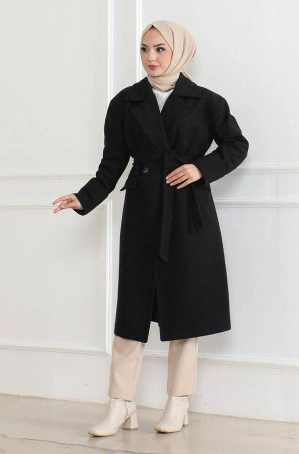 Kaşe Kaban – Uzun Boy Kruvaze Yaka, Kuşaklı Tesettür Kışlık Kaban, Astarlı Şık Yünlü Dokuma Oversize Rahat Kalıp, Cepli Modern Kaşe Mont Modeli - Siyah