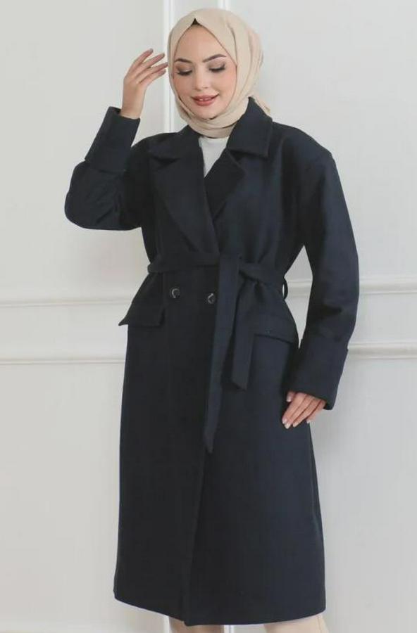 Kaşe Kaban Uzun Boy Kruvaze Yaka Kuşaklı Tesettür Kaşe Kaban Astarlı - Lacivert