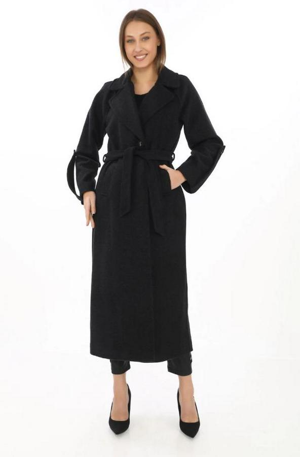 Uzun Kaşe Kaban – Yünlü Dokuma Kaşmir Kumaş, Kruvaze Yaka, Kuşaklı Astarlı Tesettür Uyumlu Şık Kışlık Siyah Model - Siyah