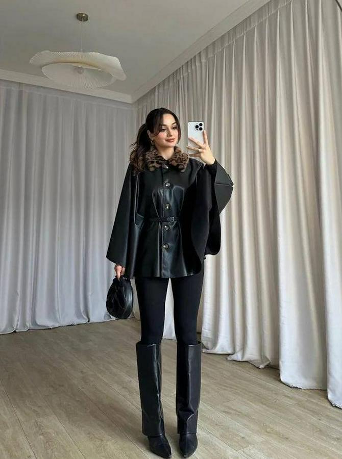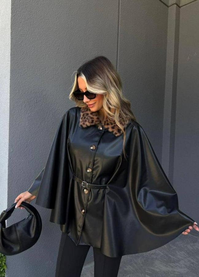 Kadın Uzun Kollu Leopar Yaka Detay Kuşak Dahil Deri Panço