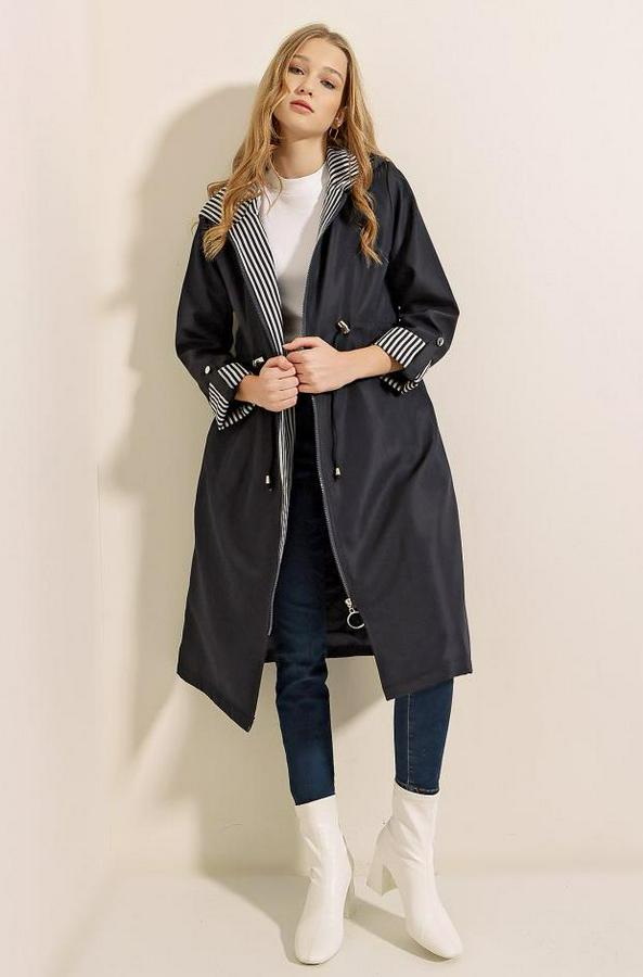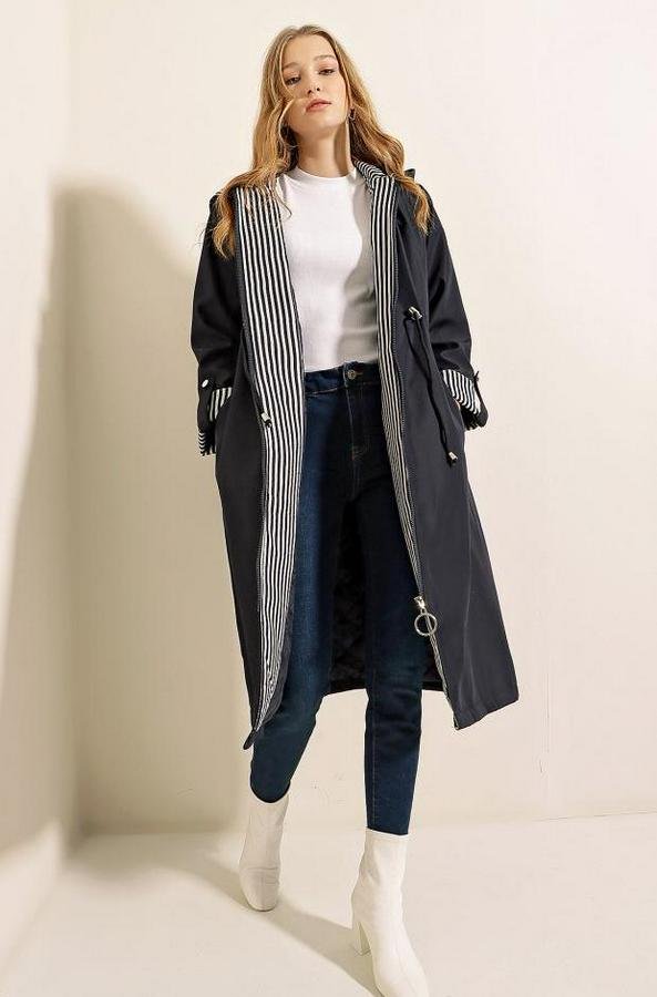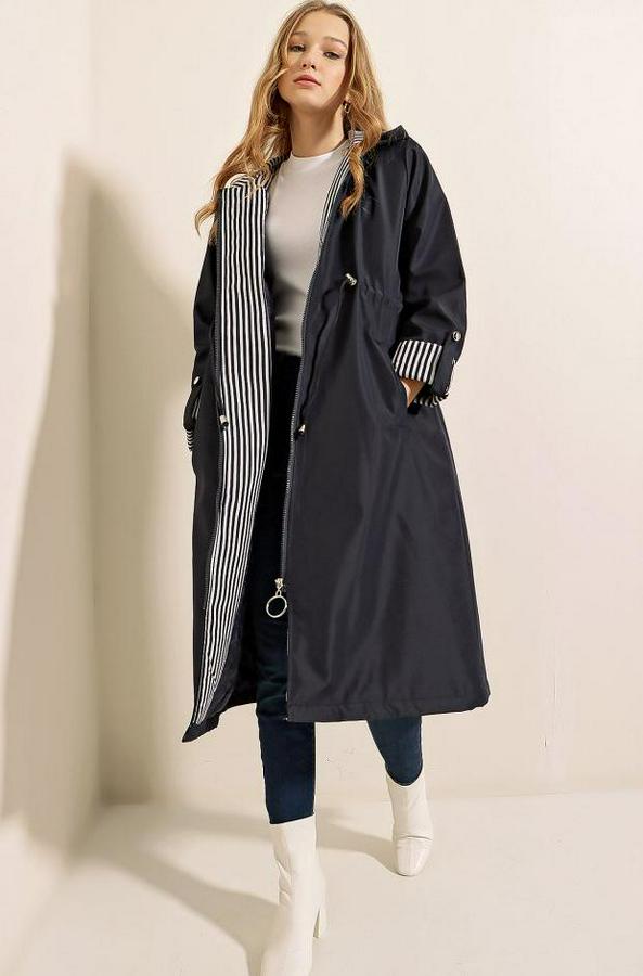 9091 Beli Büzgülü Kapşonlu Trençkot - Lacivert