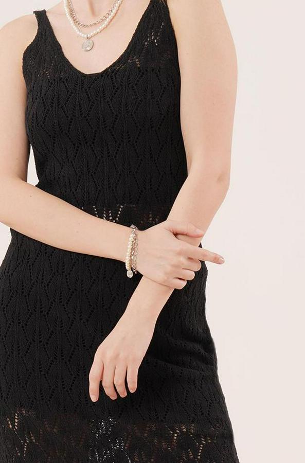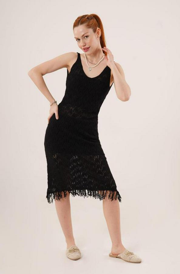 Ajurlu V Yaka Püskül Detaylı Siyah Elbise