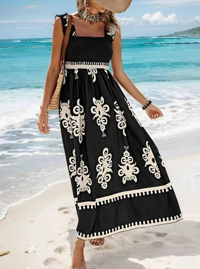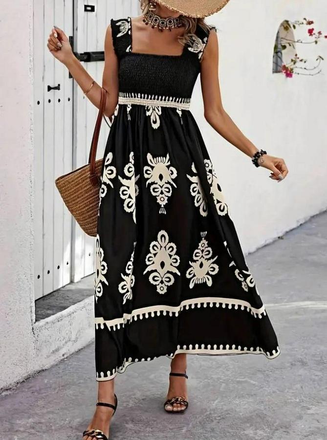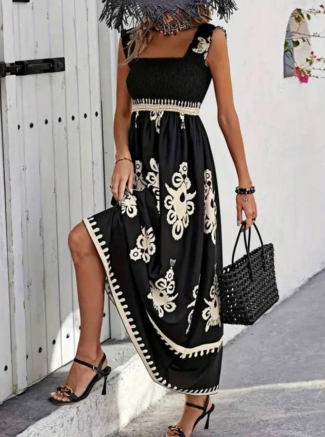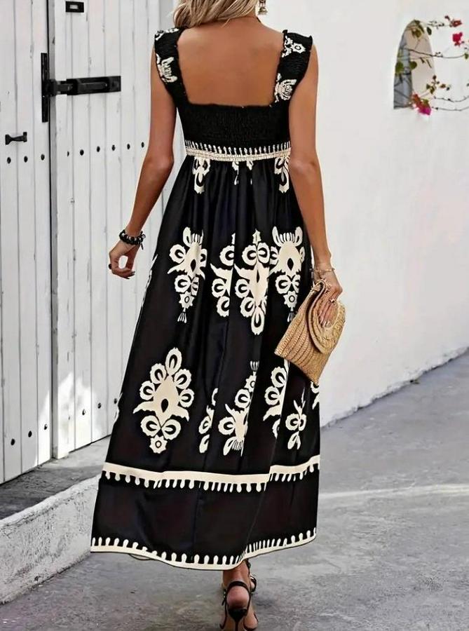 Askılı Kare Yaka Gipe Detaylı Desenli Suprem Elbise