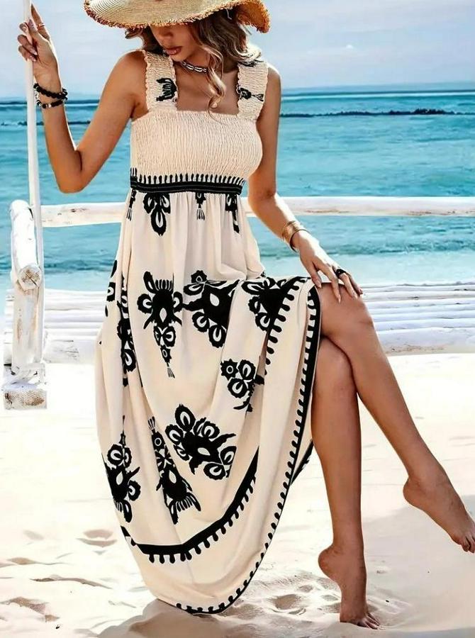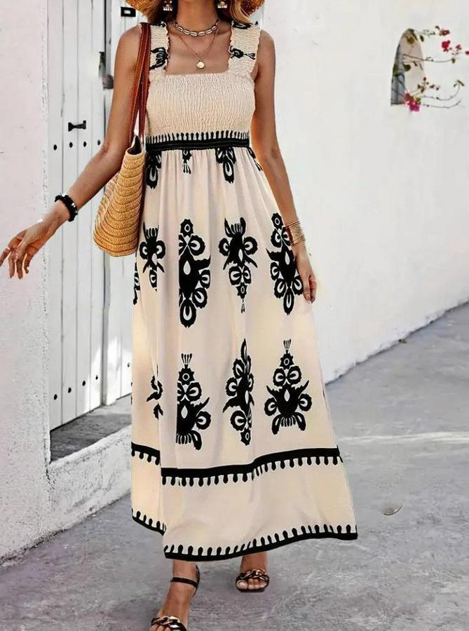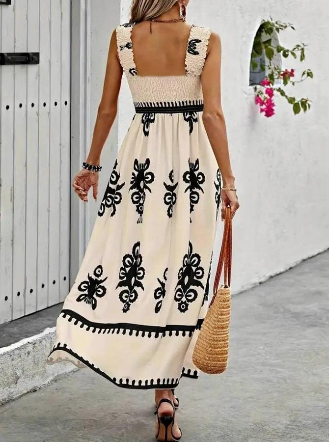 Askılı Kare Yaka Gipe Detaylı Desenli Suprem Elbise