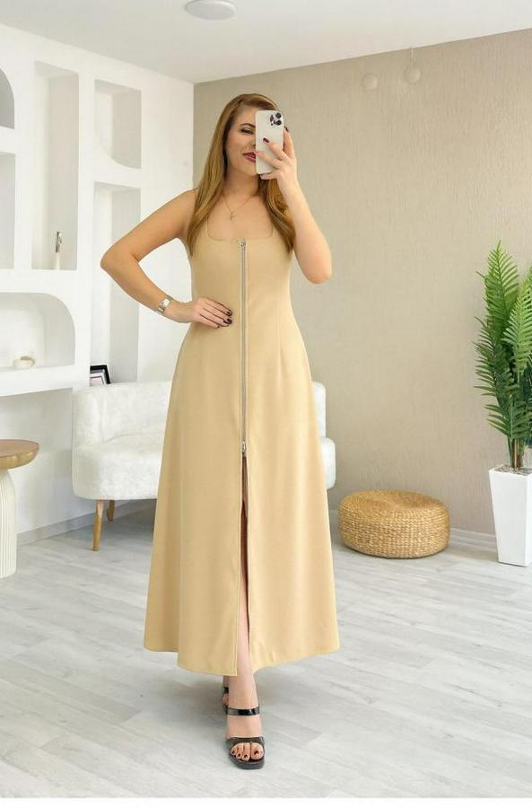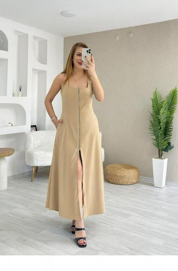 Kadın Askılı Kare Yaka önden Fermuarlı Geniş Kesim Janjan Krep Elbise