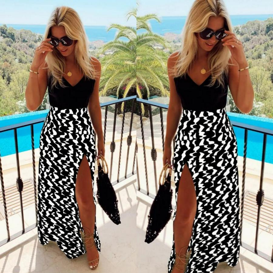 Kadın Askılı V Yaka Eteği Dijital Baskılı Dalmaçya Desen Yırtmaçlı Mikro Kumaş Elbise