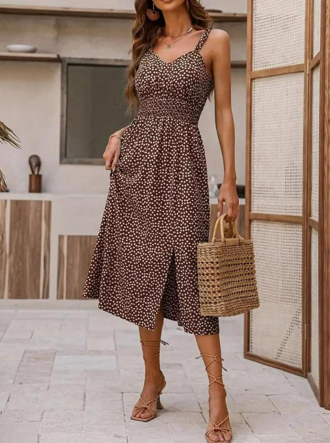 AnasayfaTüm ÜrünlerElbiseAskılı V Yakalı Beli Lastikli Yırtmaçlı Süprem Midi Elbise