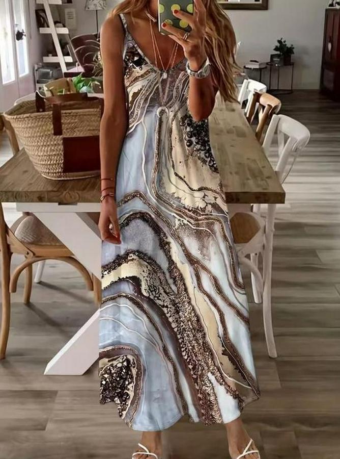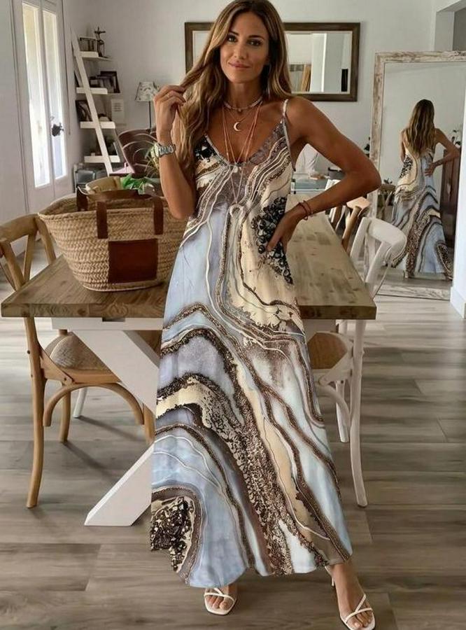 AnasayfaTüm ÜrünlerElbiseAskılı V Yakalı Desenlı Uzun Süprem Elbise