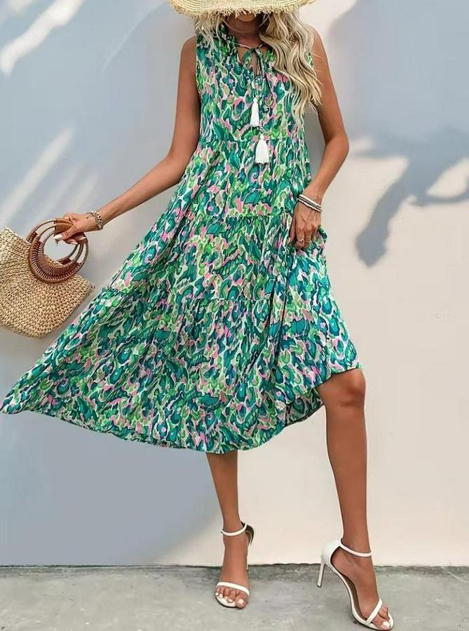 AnasayfaTüm ÜrünlerElbiseAskılı Yakası Fırfırlı Bağcıklı Desenli Uzun Süprem Elbise