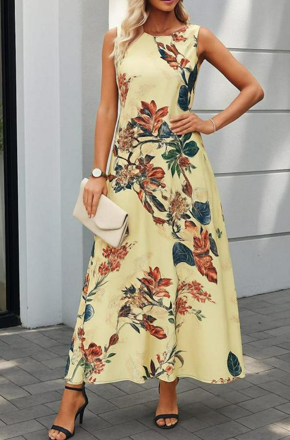 Askılı Yuvarlak Yaka Cepli Desenli Süprem Elbise