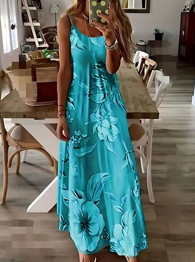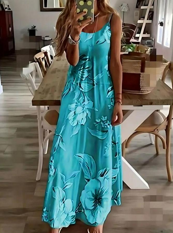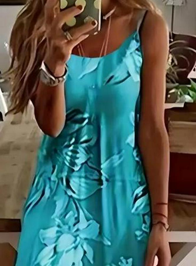 Kadın Askılı Yuvarlak Yaka Etek Geniş Kesim Desenli Süprem Elbise