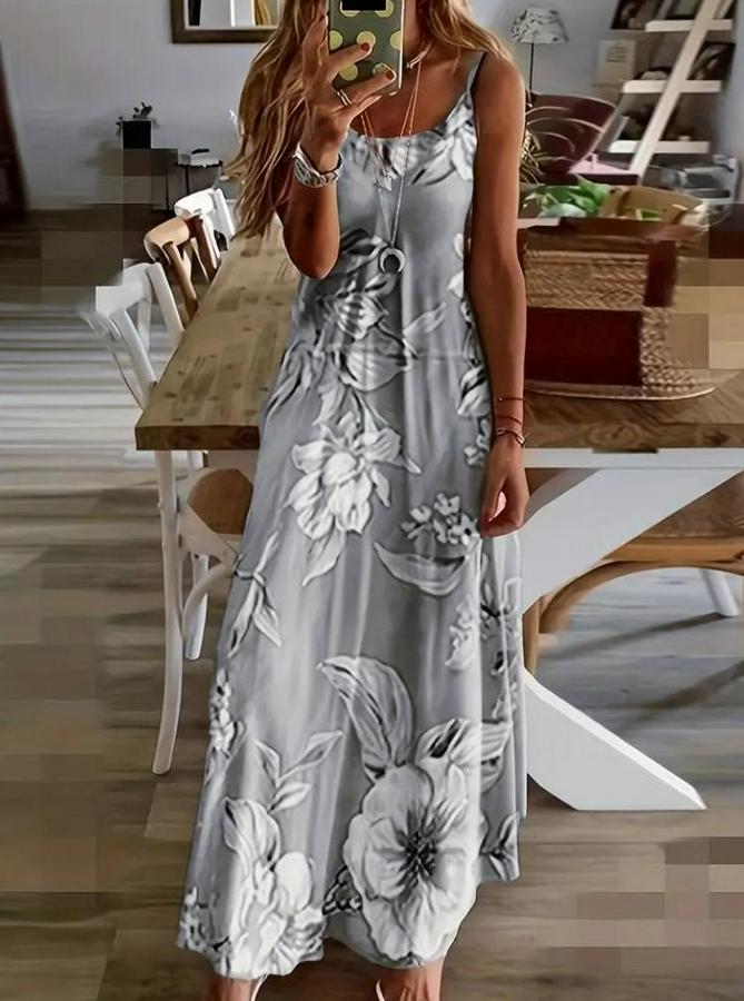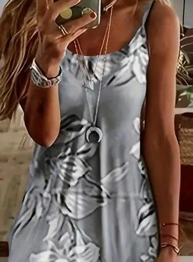 Askılı Yuvarlak Yaka Etek Geniş Kesim Desenli Süprem Elbise