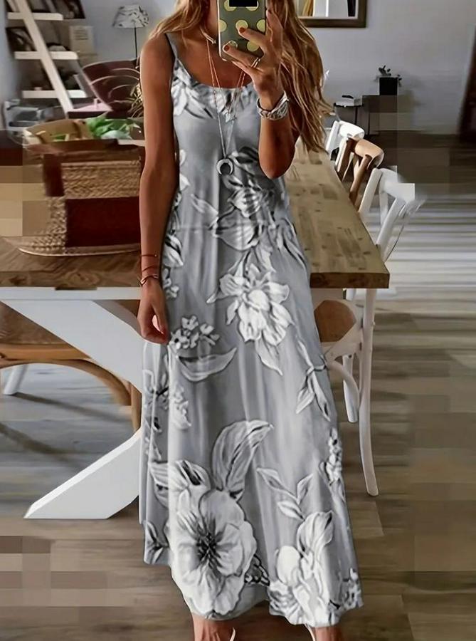 Kadın Askılı Yuvarlak Yaka Etek Geniş Kesim Desenli Süprem Elbise