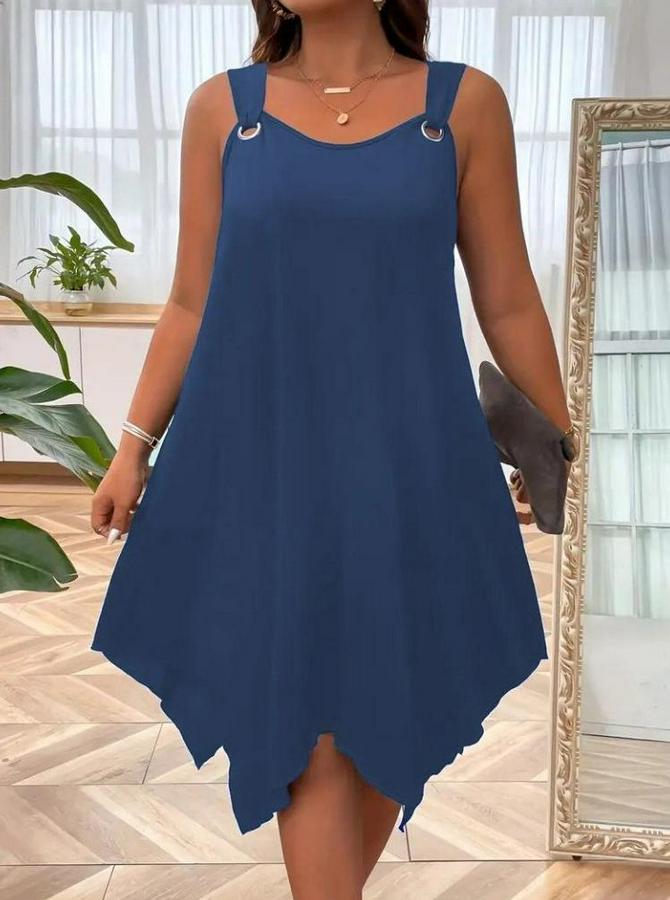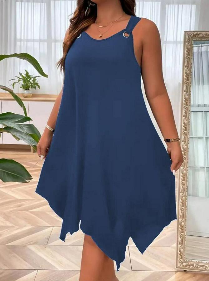 Askılı Yuvarlak Yaka Kuş Gözü Detaylı Asimetrik Viskon Elbise